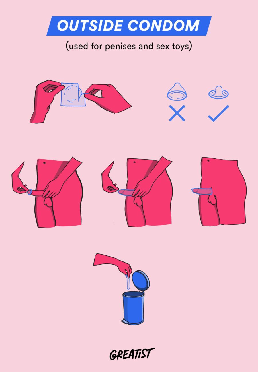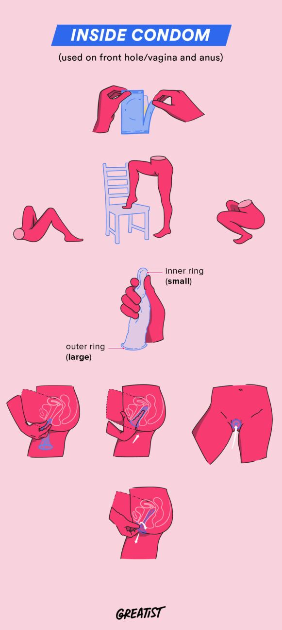 Note: If you’re having penile-vaginal sex, make sure the penis or sex toy (i.e. dildo) doesn’t go in between the condom and the walls of your vagina. And if the outer ring gets pushed into the vagina, stop having sex and readjust.